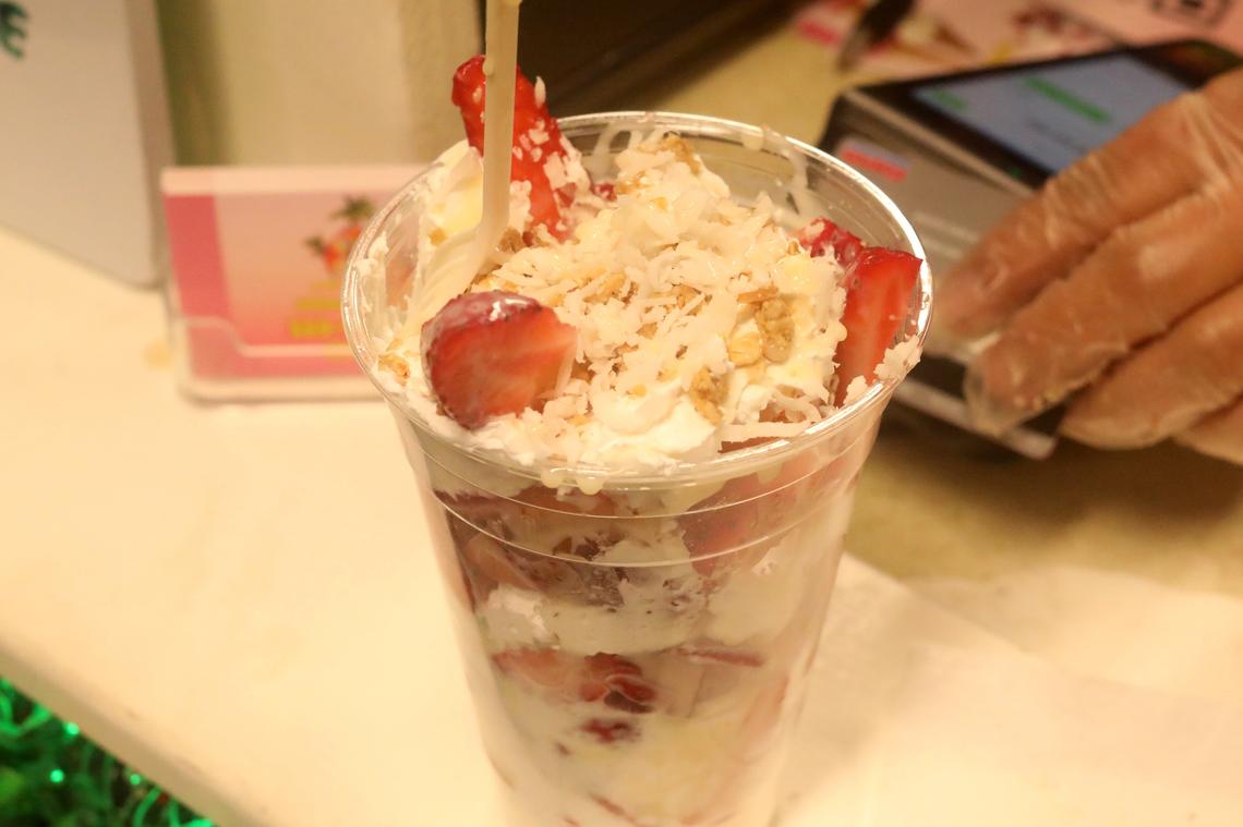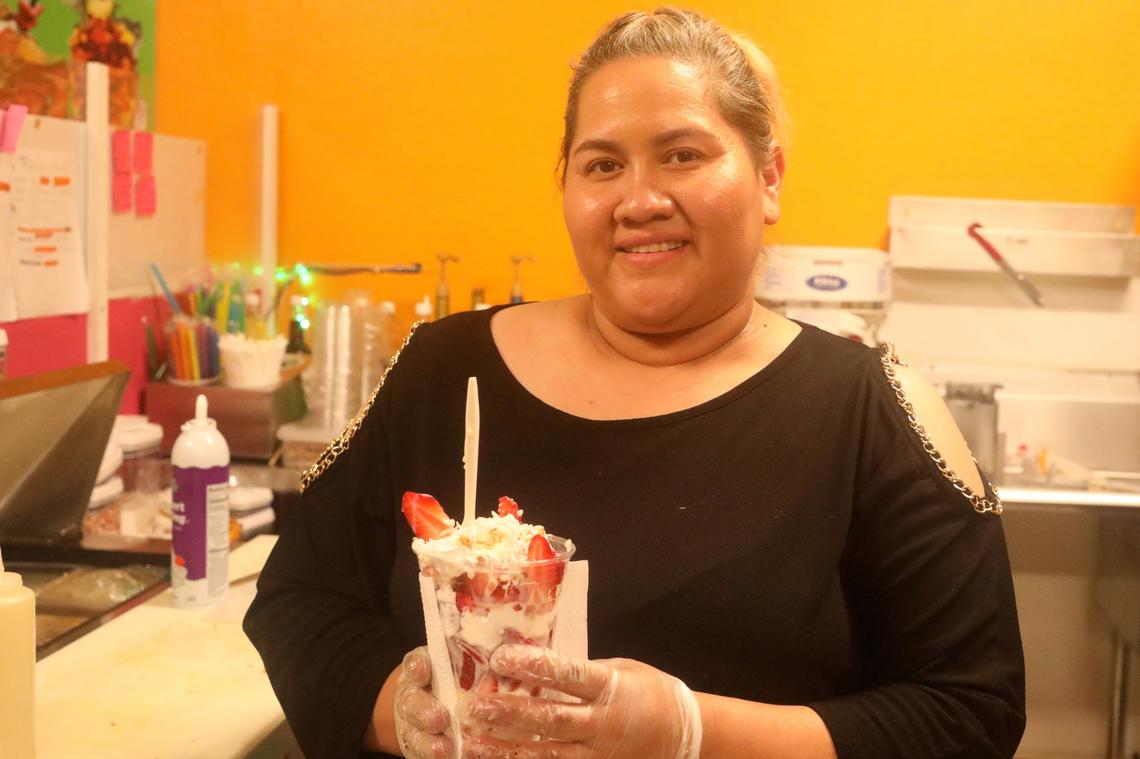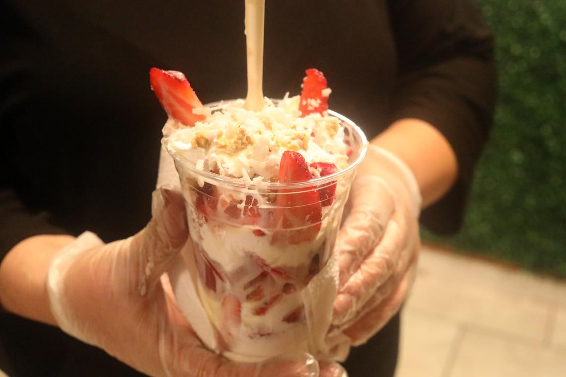 Las fresas con crema incluyen leche condensada, coco, granola, crema batida, “y una crema preparada que hago para darle ese ‘toque rico’”, dijo Calderón.