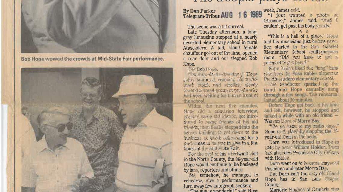 Legendary entertainer Bob Hope performed at the California Mid-State Fair in August 1989. One lucky Tribune reporter got to follow him around for the day, from his rehearsal at an Atascadero Elementary School to backstage at his show.