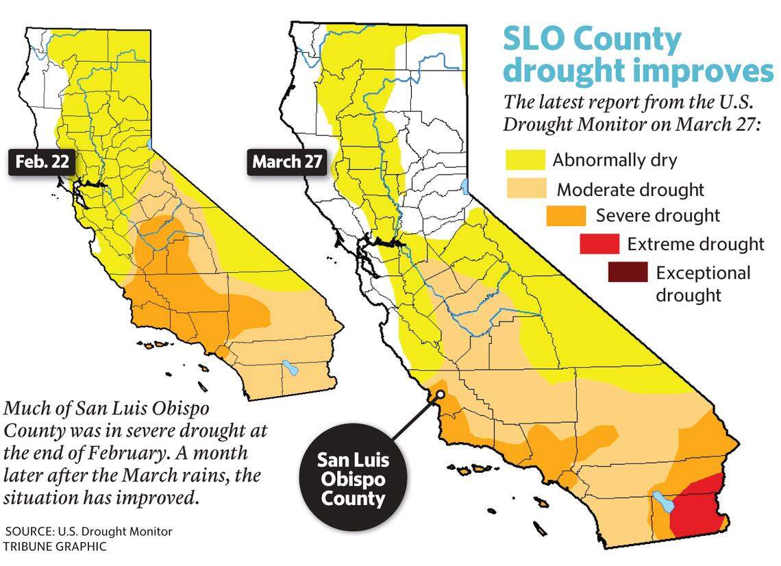 The "Minor Miracle March" storms that hit San Luis Obispo County last week lifted a sizeable chunk of the county out of severe drought conditions, according to the U.S. Drought Monitor.