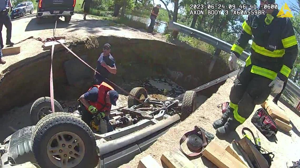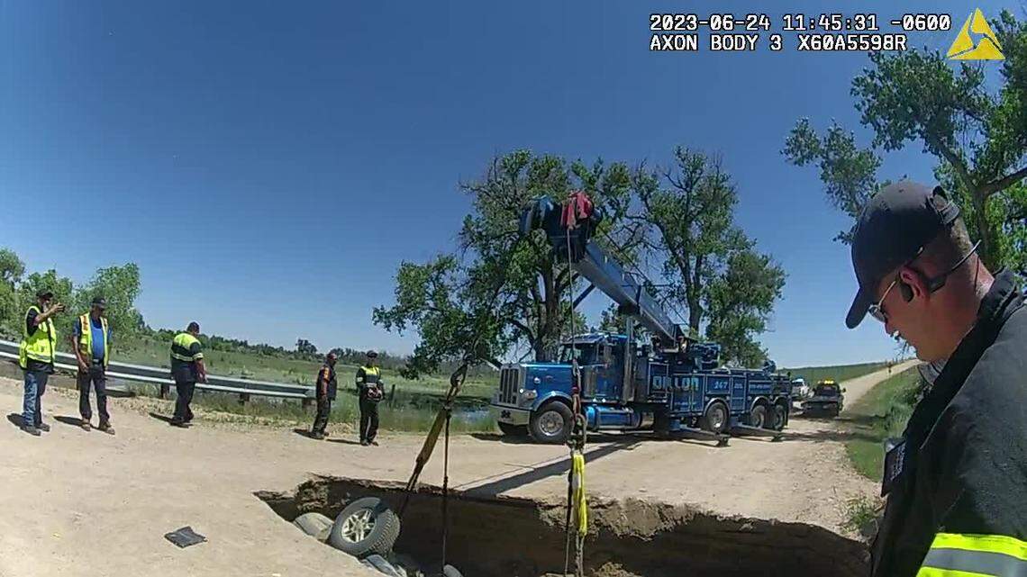 The sinkhole swallowed the car about 9:15 a.m. on Saturday near Weld County Road 2 and Watkins Road in Brighton with two people inside. The 66-year-old driver had just driven the Jeep Grand Cherokee east over the bridge when the ground started giving way underneath the front of the car, officials said in an email.