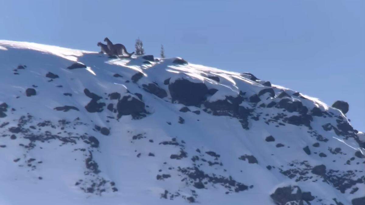 The video shows the mountain lions climbing along the snowy peak, the ends of their long tails swishing as they look out over the landscape.